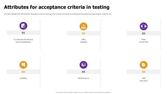 This slide highlights the attributes for acceptance criteria in testing which includes functional correctness and completeness, data integrity, usability, etc. Get a simple yet stunning designed Attributes For Acceptance Effective Test Data Management Ppt Powerpoint It is the best one to establish the tone in your meetings. It is an excellent way to make your presentations highly effective. So, download this PPT today from Slidegeeks and see the positive impacts. Our easy-to-edit Attributes For Acceptance Effective Test Data Management Ppt Powerpoint can be your go-to option for all upcoming conferences and meetings. So, what are you waiting for Grab this template today. This slide highlights the attributes for acceptance criteria in testing which includes functional correctness and completeness, data integrity, usability, etc.
