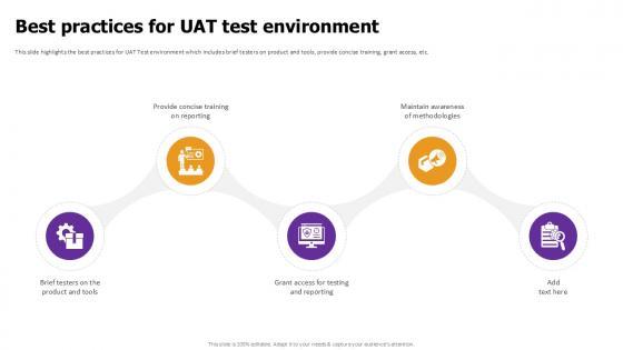 This slide highlights the best practices for UAT Test environment which includes brief testers on product and tools, provide concise training, grant access, etc. Present like a pro with Best Practices For UAT Test Effective Test Data Management Ppt Powerpoint Create beautiful presentations together with your team, using our easy-to-use presentation slides. Share your ideas in real-time and make changes on the fly by downloading our templates. So whether you are in the office, on the go, or in a remote location, you can stay in sync with your team and present your ideas with confidence. With Slidegeeks presentation got a whole lot easier. Grab these presentations today. This slide highlights the best practices for UAT Test environment which includes brief testers on product and tools, provide concise training, grant access, etc.