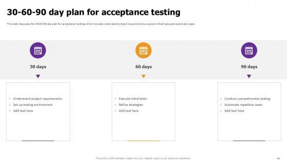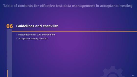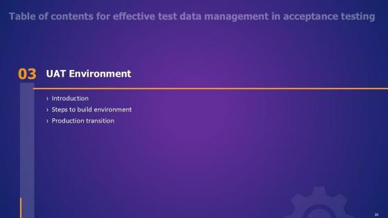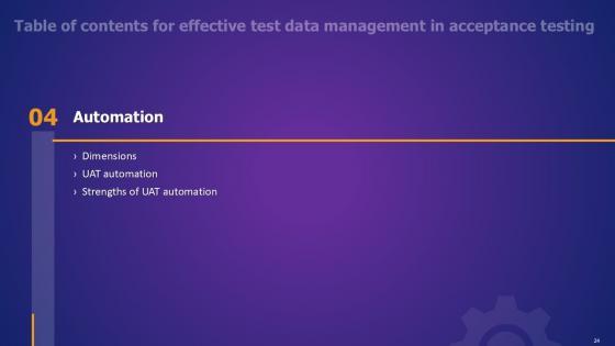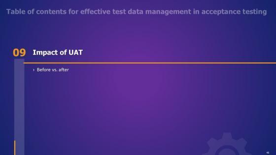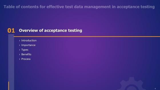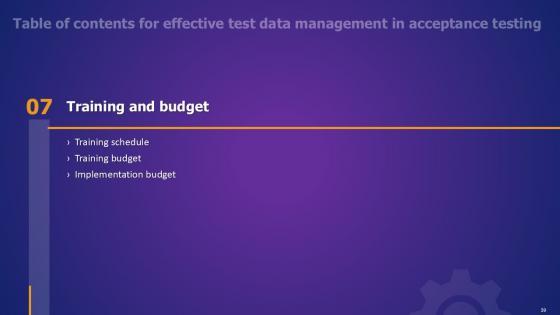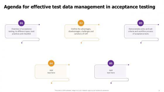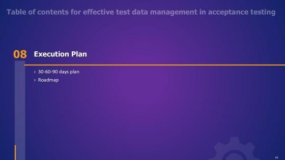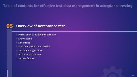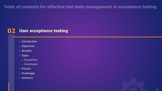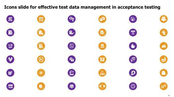 Use this Effective Test Data Management in Acceptance Testing PPT Example to ensure the business world gets to know you as a presentation expert with tremendous recall value. With its focus on providing the worlds best designs to highlight business ideas that have the potential to change the world, this PPT Template is sure to win you clients. The complete deck in fifty seven slides is a compendium of information, structured in a manner that provides the best framework for a presentation. Use this completely editable and customizable presentation to make an impact and improve your order book. Download now. Our Effective Test Data Management in Acceptance Testing PPT Example are topically designed to provide an attractive backdrop to any subject. Use them to look like a presentation pro.