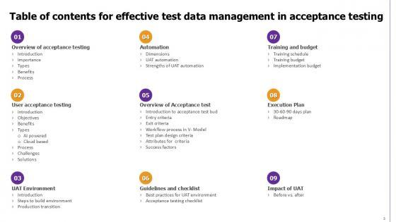 Here you can discover an assortment of the finest PowerPoint and Google Slides templates. With these templates, you can create presentations for a variety of purposes while simultaneously providing your audience with an eye-catching visual experience. Download Table Of Contents For Effective Test Data Management In Acceptance Testing Ppt Powerpoint to deliver an impeccable presentation. These templates will make your job of preparing presentations much quicker, yet still, maintain a high level of quality. Slidegeeks has experienced researchers who prepare these templates and write high-quality content for you. Later on, you can personalize the content by editing the Table Of Contents For Effective Test Data Management In Acceptance Testing Ppt Powerpoint Our Table Of Contents For Effective Test Data Management In Acceptance Testing Ppt Powerpoint are topically designed to provide an attractive backdrop to any subject. Use them to look like a presentation pro.
