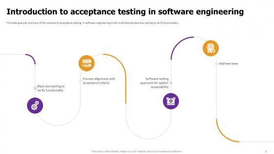 This slide gives an overview of the concept of acceptance testing in software engineering which is defined as black box testing to verify functionality. Coming up with a presentation necessitates that the majority of the effort goes into the content and the message you intend to convey. The visuals of a PowerPoint presentation can only be effective if it supplements and supports the story that is being told. Keeping this in mind our experts created Introduction To Acceptance Testing Effective Test Data Management Ppt Sample to reduce the time that goes into designing the presentation. This way, you can concentrate on the message while our designers take care of providing you with the right template for the situation. This slide gives an overview of the concept of acceptance testing in software engineering which is defined as black box testing to verify functionality.