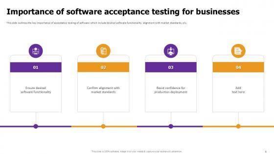 This slide outlines the key importance of acceptance testing of software which include desired software functionality, alignment with market standards, etc. Formulating a presentation can take up a lot of effort and time, so the content and message should always be the primary focus. The visuals of the PowerPoint can enhance the presenters message, so our Importance Of Software Effective Test Data Management Ppt Sample was created to help save time. Instead of worrying about the design, the presenter can concentrate on the message while our designers work on creating the ideal templates for whatever situation is needed. Slidegeeks has experts for everything from amazing designs to valuable content, we have put everything into Importance Of Software Effective Test Data Management Ppt Sample This slide outlines the key importance of acceptance testing of software which include desired software functionality, alignment with market standards, etc.