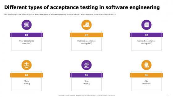 This slide highlights the different types of acceptance testing in software engineering which include user acceptance tests, business acceptance tests, etc. Find highly impressive Different Types Of Acceptance Effective Test Data Management Ppt Slide on Slidegeeks to deliver a meaningful presentation. You can save an ample amount of time using these presentation templates. No need to worry to prepare everything from scratch because Slidegeeks experts have already done a huge research and work for you. You need to download Different Types Of Acceptance Effective Test Data Management Ppt Slide for your upcoming presentation. All the presentation templates are 100 percent editable and you can change the color and personalize the content accordingly. Download now This slide highlights the different types of acceptance testing in software engineering which include user acceptance tests, business acceptance tests, etc.