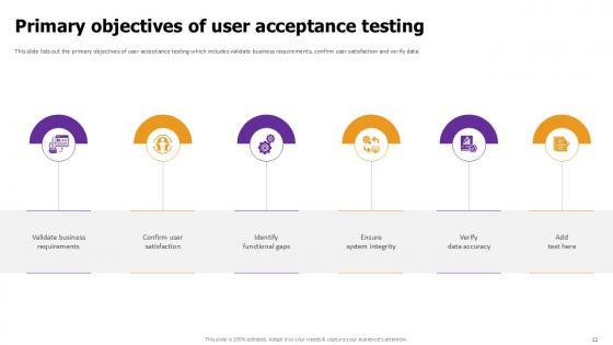 This slide lists out the primary objectives of user acceptance testing which includes validate business requirements, confirm user satisfaction and verify data. The best PPT templates are a great way to save time, energy, and resources. Slidegeeks have 100 percent editable powerpoint slides making them incredibly versatile. With these quality presentation templates, you can create a captivating and memorable presentation by combining visually appealing slides and effectively communicating your message. Download Primary Objectives Of User Effective Test Data Management Ppt Template from Slidegeeks and deliver a wonderful presentation. This slide lists out the primary objectives of user acceptance testing which includes validate business requirements, confirm user satisfaction and verify data.