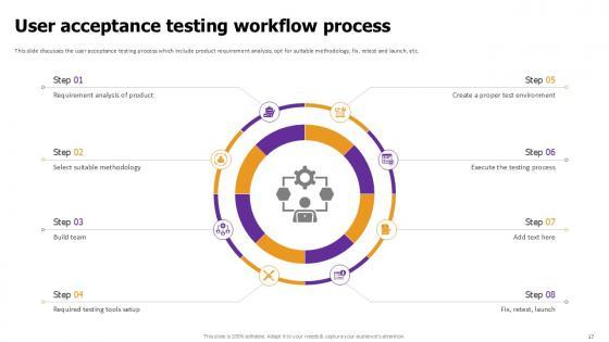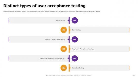 This slide gives an overview of the concept of user acceptance testing which is the last testing phase and is the final check before deployment. This modern and well-arranged Introduction To User Acceptance Effective Test Data Management Ppt Powerpoint provides lots of creative possibilities. It is very simple to customize and edit with the Powerpoint Software. Just drag and drop your pictures into the shapes. All facets of this template can be edited with Powerpoint, no extra software is necessary. Add your own material, put your images in the places assigned for them, adjust the colors, and then you can show your slides to the world, with an animated slide included. This slide gives an overview of the concept of user acceptance testing which is the last testing phase and is the final check before deployment.
