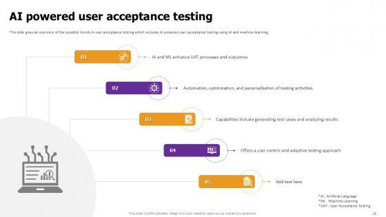 This slide gives an overview of the possible trends in user acceptance testing which includes AI powered user acceptance testing using AI and machine learning. Do you have to make sure that everyone on your team knows about any specific topic I yes, then you should give Ai Powered User Acceptance Effective Test Data Management Ppt Sample a try. Our experts have put a lot of knowledge and effort into creating this impeccable Ai Powered User Acceptance Effective Test Data Management Ppt Sample You can use this template for your upcoming presentations, as the slides are perfect to represent even the tiniest detail. You can download these templates from the Slidegeeks website and these are easy to edit. So grab these today This slide gives an overview of the possible trends in user acceptance testing which includes AI powered user acceptance testing using AI and machine learning.