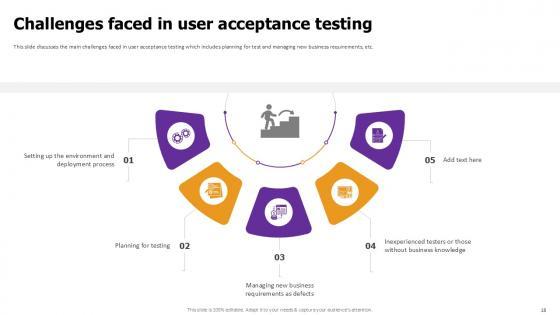 This slide discusses the main challenges faced in user acceptance testing which includes planning for test and managing new business requirements, etc. Slidegeeks is here to make your presentations a breeze with Challenges Faced In User Effective Test Data Management Ppt Slide With our easy-to-use and customizable templates, you can focus on delivering your ideas rather than worrying about formatting. With a variety of designs to choose from, you are sure to find one that suits your needs. And with animations and unique photos, illustrations, and fonts, you can make your presentation pop. So whether you are giving a sales pitch or presenting to the board, make sure to check out Slidegeeks first This slide discusses the main challenges faced in user acceptance testing which includes planning for test and managing new business requirements, etc.