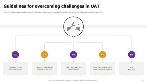 This slide highlights the guidelines for overcoming challenges in user acceptance testing which includes effectively control release cycle, skilled testers and so on. Make sure to capture your audiences attention in your business displays with our gratis customizable Guidelines For Overcoming Challenges Effective Test Data Management Ppt Presentation These are great for business strategies, office conferences, capital raising or task suggestions. If you desire to acquire more customers for your tech business and ensure they stay satisfied, create your own sales presentation with these plain slides. This slide highlights the guidelines for overcoming challenges in user acceptance testing which includes effectively control release cycle, skilled testers and so on.