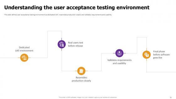 This slide defines user acceptance testing environment as dedicated UAT, resembles production closely and validates requirements and usability. Find a pre-designed and impeccable Understanding The User Acceptance Effective Test Data Management Ppt Sample The templates can ace your presentation without additional effort. You can download these easy-to-edit presentation templates to make your presentation stand out from others. So, what are you waiting for Download the template from Slidegeeks today and give a unique touch to your presentation. This slide defines user acceptance testing environment as dedicated UAT, resembles production closely and validates requirements and usability.