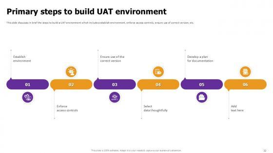 This slide discusses in brief the steps to build a UAT environment which includes establish environment, enforce access controls, ensure use of correct version, etc. The Primary Steps To Build UAT Effective Test Data Management Ppt Sample is a compilation of the most recent design trends as a series of slides. It is suitable for any subject or industry presentation, containing attractive visuals and photo spots for businesses to clearly express their messages. This template contains a variety of slides for the user to input data, such as structures to contrast two elements, bullet points, and slides for written information. Slidegeeks is prepared to create an impression. This slide discusses in brief the steps to build a UAT environment which includes establish environment, enforce access controls, ensure use of correct version, etc.