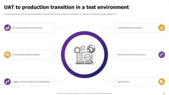 This slide discusses the UAT to production transition in test environment which include set up production environment, ensure product quality validation, etc. Take your projects to the next level with our ultimate collection of UAT To Production Transition Effective Test Data Management Ppt Sample Slidegeeks has designed a range of layouts that are perfect for representing task or activity duration, keeping track of all your deadlines at a glance. Tailor these designs to your exact needs and give them a truly corporate look with your own brand colors they will make your projects stand out from the rest This slide discusses the UAT to production transition in test environment which include set up production environment, ensure product quality validation, etc.