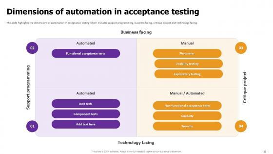 This slide highlights the dimensions of automation in acceptance testing which includes support programming, business facing, critique project and technology facing. If your project calls for a presentation, then Slidegeeks is your go-to partner because we have professionally designed, easy-to-edit templates that are perfect for any presentation. After downloading, you can easily edit Dimensions Of Automation Effective Test Data Management Ppt Powerpoint and make the changes accordingly. You can rearrange slides or fill them with different images. Check out all the handy templates This slide highlights the dimensions of automation in acceptance testing which includes support programming, business facing, critique project and technology facing.