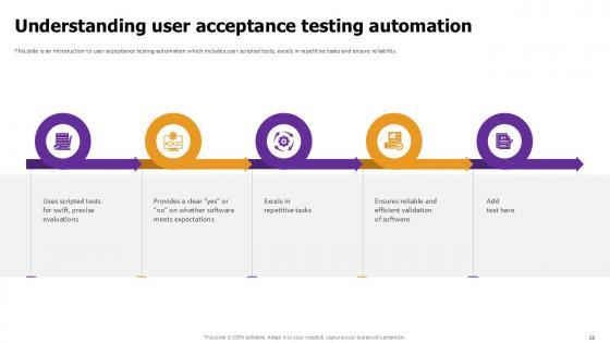 This slide is an introduction to user acceptance testing automation which includes user scripted tests, excels in repetitive tasks and ensure reliability. Boost your pitch with our creative Understanding User Acceptance Effective Test Data Management Ppt Template Deliver an awe-inspiring pitch that will mesmerize everyone. Using these presentation templates you will surely catch everyones attention. You can browse the ppts collection on our website. We have researchers who are experts at creating the right content for the templates. So you do not have to invest time in any additional work. Just grab the template now and use them. This slide is an introduction to user acceptance testing automation which includes user scripted tests, excels in repetitive tasks and ensure reliability.