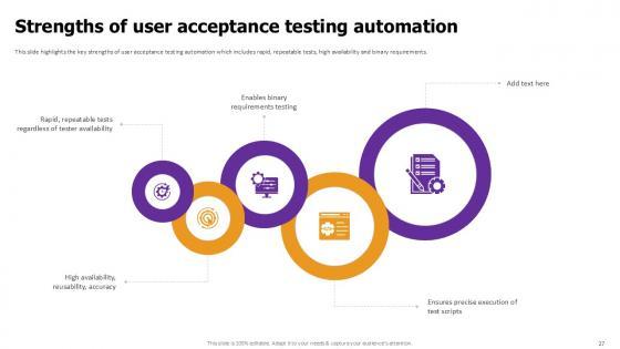 This slide highlights the key strengths of user acceptance testing automation which includes rapid, repeatable tests, high availability and binary requirements. Retrieve professionally designed Strengths Of User Acceptance Effective Test Data Management Ppt Powerpoint to effectively convey your message and captivate your listeners. Save time by selecting pre-made slideshows that are appropriate for various topics, from business to educational purposes. These themes come in many different styles, from creative to corporate, and all of them are easily adjustable and can be edited quickly. Access them as PowerPoint templates or as Google Slides themes. You do not have to go on a hunt for the perfect presentation because Slidegeeks got you covered from everywhere. This slide highlights the key strengths of user acceptance testing automation which includes rapid, repeatable tests, high availability and binary requirements.