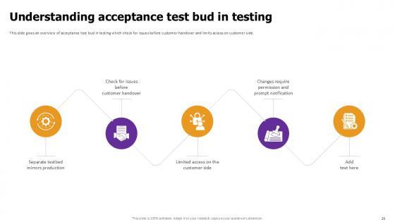 This slide gives an overview of acceptance test bud in testing which check for issues before customer handover and limits access on customer side. Do you know about Slidesgeeks Understanding Acceptance Effective Test Data Management Ppt Powerpoint These are perfect for delivering any kind od presentation. Using it, create PowerPoint presentations that communicate your ideas and engage audiences. Save time and effort by using our pre-designed presentation templates that are perfect for a wide range of topic. Our vast selection of designs covers a range of styles, from creative to business, and are all highly customizable and easy to edit. Download as a PowerPoint template or use them as Google Slides themes. This slide gives an overview of acceptance test bud in testing which check for issues before customer handover and limits access on customer side.