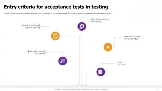 This slide discusses the exit criteria for acceptance tests which include pass all acceptance tests, stakeholders sign off, fix and verify major defects. Crafting an eye-catching presentation has never been more straightforward. Let your presentation shine with this tasteful yet straightforward Exit Criteria For Acceptance Effective Test Data Management Ppt Powerpoint template. It offers a minimalistic and classy look that is great for making a statement. The colors have been employed intelligently to add a bit of playfulness while still remaining professional. Construct the ideal Exit Criteria For Acceptance Effective Test Data Management Ppt Powerpoint that effortlessly grabs the attention of your audience Begin now and be certain to wow your customers This slide discusses the exit criteria for acceptance tests which include pass all acceptance tests, stakeholders sign off, fix and verify major defects.