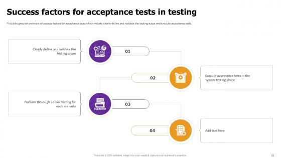 This slide gives an overview of success factors for acceptance tests which include clearly define and validate the testing scope and execute acceptance tests. Slidegeeks has constructed Success Factors For Acceptance Effective Test Data Management Ppt Powerpoint after conducting extensive research and examination. These presentation templates are constantly being generated and modified based on user preferences and critiques from editors. Here, you will find the most attractive templates for a range of purposes while taking into account ratings and remarks from users regarding the content. This is an excellent jumping-off point to explore our content and will give new users an insight into our top-notch PowerPoint Templates. This slide gives an overview of success factors for acceptance tests which include clearly define and validate the testing scope and execute acceptance tests.