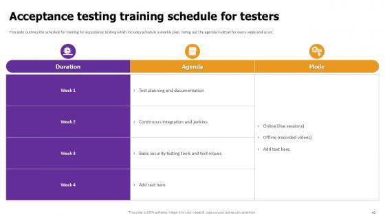 This slide outlines the schedule for training for acceptance testing which includes schedule a weekly plan, listing out the agenda in detail for every week and so on. Want to ace your presentation in front of a live audience Our Acceptance Testing Training Effective Test Data Management Ppt Example can help you do that by engaging all the users towards you. Slidegeeks experts have put their efforts and expertise into creating these impeccable powerpoint presentations so that you can communicate your ideas clearly. Moreover, all the templates are customizable, and easy-to-edit and downloadable. Use these for both personal and commercial use. This slide outlines the schedule for training for acceptance testing which includes schedule a weekly plan, listing out the agenda in detail for every week and so on.