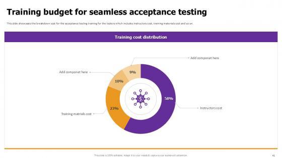 This slide showcases the breakdown cost for the acceptance testing training for the testers which includes instructors cost, training materials cost and so on. This Training Budget For Seamless Effective Test Data Management Ppt Template from Slidegeeks makes it easy to present information on your topic with precision. It provides customization options, so you can make changes to the colors, design, graphics, or any other component to create a unique layout. It is also available for immediate download, so you can begin using it right away. Slidegeeks has done good research to ensure that you have everything you need to make your presentation stand out. Make a name out there for a brilliant performance. This slide showcases the breakdown cost for the acceptance testing training for the testers which includes instructors cost, training materials cost and so on.