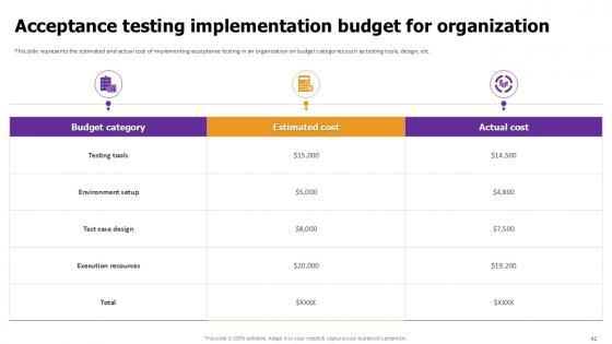 This slide represents the estimated and actual cost of implementing acceptance testing in an organization on budget categories such as testing tools, design, etc. Slidegeeks is one of the best resources for PowerPoint templates. You can download easily and regulate Acceptance Testing Implementation Effective Test Data Management Ppt Sample for your personal presentations from our wonderful collection. A few clicks is all it takes to discover and get the most relevant and appropriate templates. Use our Templates to add a unique zing and appeal to your presentation and meetings. All the slides are easy to edit and you can use them even for advertisement purposes. This slide represents the estimated and actual cost of implementing acceptance testing in an organization on budget categories such as testing tools, design, etc.