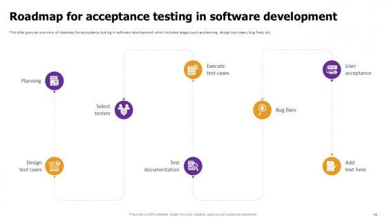 This slide gives an overview of roadmap for acceptance testing in software development which includes stages such as planning, design test cases, bug fixes, etc. Are you searching for a Roadmap For Acceptance Testing Effective Test Data Management Ppt Example that is uncluttered, straightforward, and original Its easy to edit, and you can change the colors to suit your personal or business branding. For a presentation that expresses how much effort you have put in, this template is ideal With all of its features, including tables, diagrams, statistics, and lists, its perfect for a business plan presentation. Make your ideas more appealing with these professional slides. Download Roadmap For Acceptance Testing Effective Test Data Management Ppt Example from Slidegeeks today. This slide gives an overview of roadmap for acceptance testing in software development which includes stages such as planning, design test cases, bug fixes, etc.