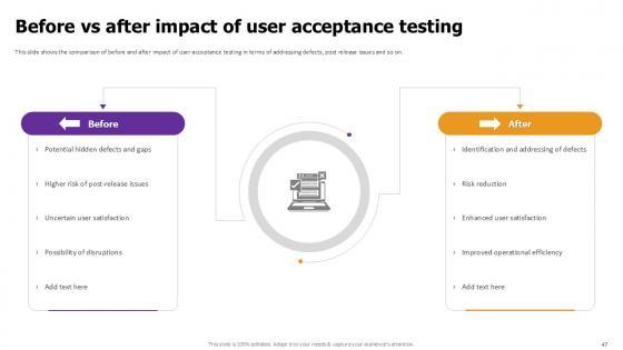 This slide shows the comparison of before and after impact of user acceptance testing in terms of addressing defects, post release issues and so on. From laying roadmaps to briefing everything in detail, our templates are perfect for you. You can set the stage with your presentation slides. All you have to do is download these easy-to-edit and customizable templates. Before Vs After Impact Effective Test Data Management Ppt Template will help you deliver an outstanding performance that everyone would remember and praise you for. Do download this presentation today. This slide shows the comparison of before and after impact of user acceptance testing in terms of addressing defects, post release issues and so on.
