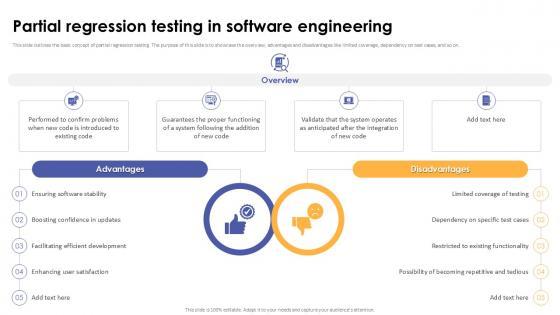 This slide outlines the basic concept of partial regression testing. The purpose of this slide is to showcase the overview, advantages and disadvantages like limited coverage, dependency on test cases, and so on. Do you have to make sure that everyone on your team knows about any specific topic I yes, then you should give Partial Regression Testing In Software Engineering Corrective Regression Testing Ppt Presentation a try. Our experts have put a lot of knowledge and effort into creating this impeccable Partial Regression Testing In Software Engineering Corrective Regression Testing Ppt Presentation You can use this template for your upcoming presentations, as the slides are perfect to represent even the tiniest detail. You can download these templates from the Slidegeeks website and these are easy to edit. So grab these today This slide outlines the basic concept of partial regression testing. The purpose of this slide is to showcase the overview, advantages and disadvantages like limited coverage, dependency on test cases, and so on.