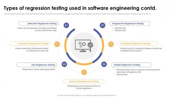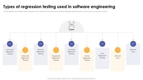 This slide represents various types involved in regression testing. The purpose of this slide is to showcase different regression testing types such as corrective, partial, unit, selective, and so on. Take your projects to the next level with our ultimate collection of Types Of Regression Testing Used In Software Engineering Corrective Regression Testing Ppt Sample Slidegeeks has designed a range of layouts that are perfect for representing task or activity duration, keeping track of all your deadlines at a glance. Tailor these designs to your exact needs and give them a truly corporate look with your own brand colors they will make your projects stand out from the rest This slide represents various types involved in regression testing. The purpose of this slide is to showcase different regression testing types such as corrective, partial, unit, selective, and so on.