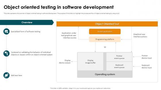 This slide represents the overview of object-oriented testing in software development. The purpose of this slide is to highlight the process and flow of object oriented testing by using a tool. Want to ace your presentation in front of a live audience Our Object Oriented Testing In Software Smoke Testing Ppt Template can help you do that by engaging all the users towards you. Slidegeeks experts have put their efforts and expertise into creating these impeccable powerpoint presentations so that you can communicate your ideas clearly. Moreover, all the templates are customizable, and easy-to-edit and downloadable. Use these for both personal and commercial use. This slide represents the overview of object-oriented testing in software development. The purpose of this slide is to highlight the process and flow of object oriented testing by using a tool.