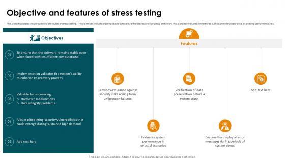This slide showcases the purpose and attributes of stress testing. The objectives include ensuring stable software, enhances recovery process, and so on. This slide also includes the features such as providing assurance, evaluating performance, etc. There are so many reasons you need a Objective And Features Of Stress Testing Smoke Testing Ppt Slides. The first reason is you can not spend time making everything from scratch, Thus, Slidegeeks has made presentation templates for you too. You can easily download these templates from our website easily. This slide showcases the purpose and attributes of stress testing. The objectives include ensuring stable software, enhances recovery process, and so on. This slide also includes the features such as providing assurance, evaluating performance, etc.