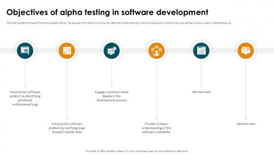 This slide highlights the goals of performing alpha testing. The purpose of this slide is to outline the objectives of alpha testing in software testing which include improving software product, clearer understanding, etc. Do you have to make sure that everyone on your team knows about any specific topic I yes, then you should give Objectives Of Alpha Testing In Software Smoke Testing Ppt Sample a try. Our experts have put a lot of knowledge and effort into creating this impeccable Objectives Of Alpha Testing In Software Smoke Testing Ppt Sample. You can use this template for your upcoming presentations, as the slides are perfect to represent even the tiniest detail. You can download these templates from the Slidegeeks website and these are easy to edit. So grab these today This slide highlights the goals of performing alpha testing. The purpose of this slide is to outline the objectives of alpha testing in software testing which include improving software product, clearer understanding, etc.