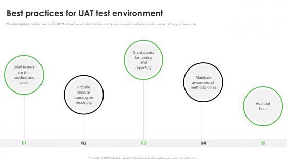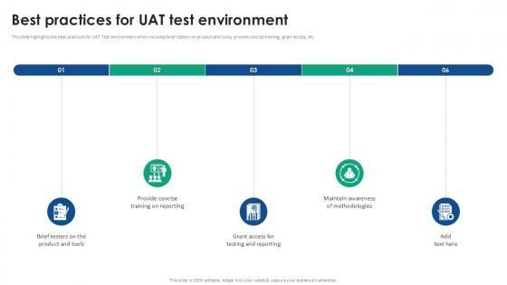 This slide highlights the best practices for UAT Test environment which includes brief testers on product and tools, provide concise training, grant access, etc. From laying roadmaps to briefing everything in detail, our templates are perfect for you. You can set the stage with your presentation slides. All you have to do is download these easy-to-edit and customizable templates. Key Steps And Strategies Best Practices For UAT Test Environment will help you deliver an outstanding performance that everyone would remember and praise you for. Do download this presentation today. This slide highlights the best practices for UAT Test environment which includes brief testers on product and tools, provide concise training, grant access, etc.