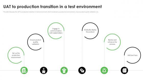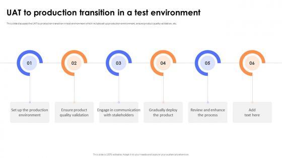 This slide discusses the UAT to production transition in test environment which include set up production environment, ensure product quality validation, etc. This Key Steps And Strategies UAT To Production Transition In A Test Environment from Slidegeeks makes it easy to present information on your topic with precision. It provides customization options, so you can make changes to the colors, design, graphics, or any other component to create a unique layout. It is also available for immediate download, so you can begin using it right away. Slidegeeks has done good research to ensure that you have everything you need to make your presentation stand out. Make a name out there for a brilliant performance. This slide discusses the UAT to production transition in test environment which include set up production environment, ensure product quality validation, etc.