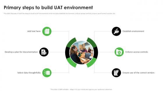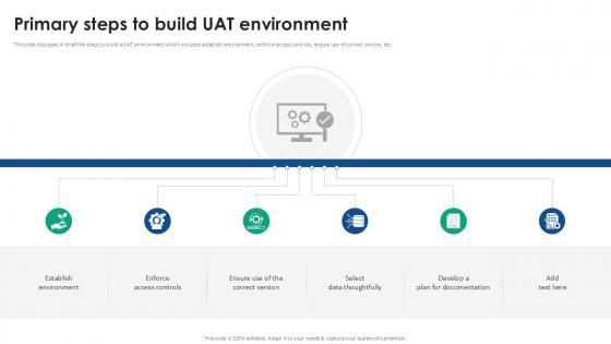 This slide discusses in brief the steps to build a UAT environment which includes establish environment, enforce access controls, ensure use of correct version, etc. Retrieve professionally designed Primary Steps To Build UAT Environment Acceptance Testing PPT Sample to effectively convey your message and captivate your listeners. Save time by selecting pre made slideshows that are appropriate for various topics, from business to educational purposes. These themes come in many different styles, from creative to corporate, and all of them are easily adjustable and can be edited quickly. Access them as PowerPoint templates or as Google Slides themes. You do not have to go on a hunt for the perfect presentation because Slidegeeks got you covered from everywhere. This slide discusses in brief the steps to build a UAT environment which includes establish environment, enforce access controls, ensure use of correct version, etc.