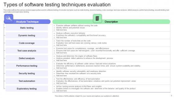This slide outlines the various analysis approaches used in software testing. It includes key types such as static testing, dynamic testing, code coverage, test case analysis, defect analysis, performance testing, security testing, test automation and exploratory testing. Showcasing this set of slides titled Types Of Software Testing Techniques Evaluation Ppt Layouts Diagrams Pdf. The topics addressed in these templates are Test Case Analysis, Defect Analysis, Performance Testing, Security Testing. All the content presented in this PPT design is completely editable. Download it and make adjustments in color, background, font etc. as per your unique business setting. This slide outlines the various analysis approaches used in software testing. It includes key types such as static testing,dynamic testing,code coverage,test case analysis,defect analysis,performance testing,security testing,test automation and exploratory testing.