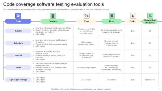 This slide outlines the he key capabilities of each code coverage analysis tools. It includes various tools with their features, pros, cons, pricing and user review. Showcasing this set of slides titled Code Coverage Software Testing Evaluation Tools Ppt Pictures Ideas Pdf. The topics addressed in these templates are Pros, Cons, Pricing, User Review. All the content presented in this PPT design is completely editable. Download it and make adjustments in color, background, font etc. as per your unique business setting. This slide outlines the he key capabilities of each code coverage analysis tools. It includes various tools with their features,pros,cons,pricing and user review.