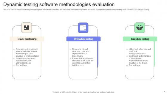 This slide outlines the dynamic testing methodologies to evaluate the functioning and behavior of software during runtime. It includes key aspects such as black box testing, white box testing and grey box testing. Pitch your topic with ease and precision using this Dynamic Testing Software Methodologies Evaluation Ppt Layouts Microsoft Pdf. This layout presents information on Black Box Testing, White Box Testing, Grey Box Testing. It is also available for immediate download and adjustment. So, changes can be made in the color, design, graphics or any other component to create a unique layout. This slide outlines the dynamic testing methodologies to evaluate the functioning and behavior of software during runtime. It includes key aspects such as black box testing,white box testing and grey box testing.