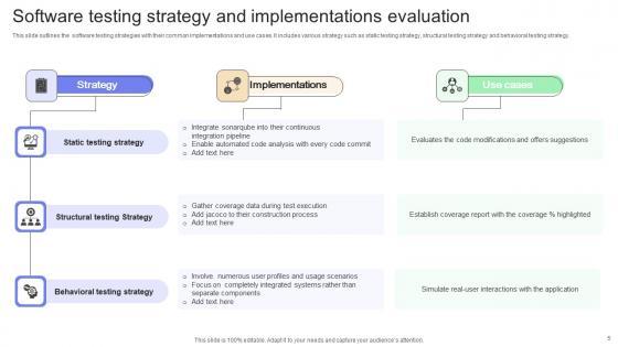 This slide outlines the software testing strategies with their common implementations and use cases. It includes various strategy such as static testing strategy, structural testing strategy and behavioral testing strategy. Pitch your topic with ease and precision using this Software Testing Strategy And Implementations Evaluation Ppt Layouts Guide Pdf. This layout presents information on Static Testing Strategy, Structural Testing Strategy, Behavioral Testing Strategy. It is also available for immediate download and adjustment. So, changes can be made in the color, design, graphics or any other component to create a unique layout. This slide outlines the software testing strategies with their common implementations and use cases. It includes various strategy such as static testing strategy,structural testing strategy and behavioral testing strategy.