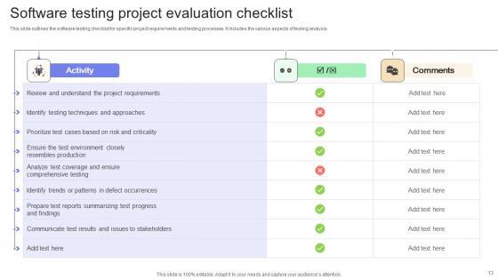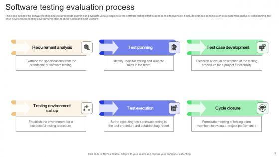 This Software Testing Evaluation Ppt Powerpoint Presentation Complete Deck With Slides acts as backup support for your ideas, vision, thoughts, etc. Use it to present a thorough understanding of the topic. This PPT slideshow can be utilized for both in-house and outside presentations depending upon your needs and business demands. Entailing seventeen slides with a consistent design and theme, this template will make a solid use case. As it is intuitively designed, it suits every business vertical and industry. All you have to do is make a few tweaks in the content or any other component to design unique presentations. The biggest advantage of this complete deck is that it can be personalized multiple times once downloaded. The color, design, shapes, and other elements are free to modify to add personal touches. You can also insert your logo design in this PPT layout. Therefore a well-thought and crafted presentation can be delivered with ease and precision by downloading this Software Testing Evaluation Ppt Powerpoint Presentation Complete Deck With Slides PPT slideshow. Our Software Testing Evaluation Ppt Powerpoint Presentation Complete Deck With Slides are topically designed to provide an attractive backdrop to any subject. Use them to look like a presentation pro.