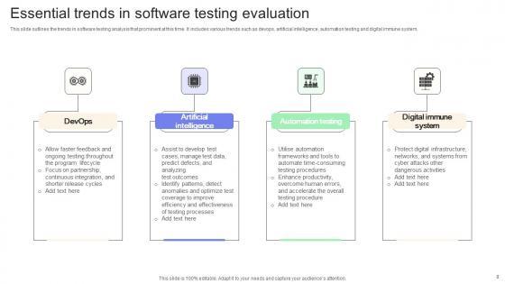 This slide outlines the trends in software testing analysis that prominent at this time. It includes various trends such as devops, artificial intelligence, automation testing and digital immune system. Showcasing this set of slides titled Essential Trends In Software Testing Evaluation Ppt Show Design Ideas Pdf. The topics addressed in these templates are Devops, Artificial Intelligence, Automation Testing. All the content presented in this PPT design is completely editable. Download it and make adjustments in color, background, font etc. as per your unique business setting. This slide outlines the trends in software testing analysis that prominent at this time. It includes various trends such as devops,artificial intelligence,automation testing and digital immune system.