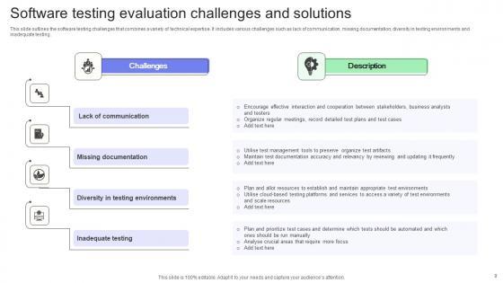 This slide outlines the software testing challenges that combines a variety of technical expertise. It includes various challenges such as lack of communication, missing documentation, diversity in testing environments and inadequate testing. Showcasing this set of slides titled Software Testing Evaluation Challenges And Solutions Ppt Topics Pdf. The topics addressed in these templates are Lack Communication, Missing Documentation, Inadequate Testing. All the content presented in this PPT design is completely editable. Download it and make adjustments in color, background, font etc. as per your unique business setting. This slide outlines the software testing challenges that combines a variety of technical expertise. It includes various challenges such as lack of communication,missing documentation,diversity in testing environments and inadequate testing.