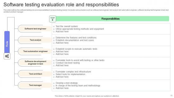 This slide outlines the software testing role and responsibilities to analyse testing needs. It includes various testers such as software test engineer, test analyst, test automation engineer, software development engineer in test, test architect and test manager. Pitch your topic with ease and precision using this Software Testing Evaluation Role And Responsibilities Ppt Infographics Template Pdf. This layout presents information on Test Analyst, Test Automation Engineer, Software Development Engineer. It is also available for immediate download and adjustment. So, changes can be made in the color, design, graphics or any other component to create a unique layout. This slide outlines the software testing role and responsibilities to analyse testing needs. It includes various testers such as software test engineer,test analyst,test automation engineer,software development engineer in test,test architect and test manager.