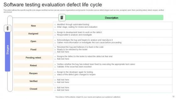 This slide outlines the specific bug life cycle stages and their names can vary across organizations and projects. It includes various defect stages such as new, assigned, open, fixed, pending retest, retest, reopen, verified and closed. Showcasing this set of slides titled Software Testing Evaluation Defect Life Cycle Ppt Pictures Templates Pdf. The topics addressed in these templates are Open, Fixed, Pending Retest, Retest. All the content presented in this PPT design is completely editable. Download it and make adjustments in color, background, font etc. as per your unique business setting. This slide outlines the specific bug life cycle stages and their names can vary across organizations and projects. It includes various defect stages such as new,assigned,open,fixed,pending retest,retest,reopen,verified and closed.