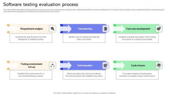 Pitch your topic with ease and precision using this Software Testing Evaluation Process Icon Ppt Infographics Visuals Pdf. This layout presents information on Software Testing, Evaluation Process, Icon. It is also available for immediate download and adjustment. So, changes can be made in the color, design, graphics or any other component to create a unique layout. Our Software Testing Evaluation Process Icon Ppt Infographics Visuals Pdf are topically designed to provide an attractive backdrop to any subject. Use them to look like a presentation pro.