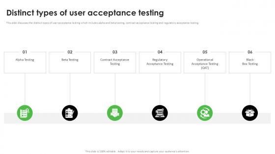This slide discusses the distinct types of user acceptance testing which includes alpha and beta testing, contract acceptance testing and regulatory acceptance testing. Are you in need of a template that can accommodate all of your creative concepts This one is crafted professionally and can be altered to fit any style. Use it with Google Slides or PowerPoint. Include striking photographs, symbols, depictions, and other visuals. Fill, move around, or remove text boxes as desired. Test out color palettes and font mixtures. Edit and save your work, or work with colleagues. Download Distinct Types Of User Acceptance Testing PPT Example and observe how to make your presentation outstanding. Give an impeccable presentation to your group and make your presentation unforgettable. This slide discusses the distinct types of user acceptance testing which includes alpha and beta testing, contract acceptance testing and regulatory acceptance testing.