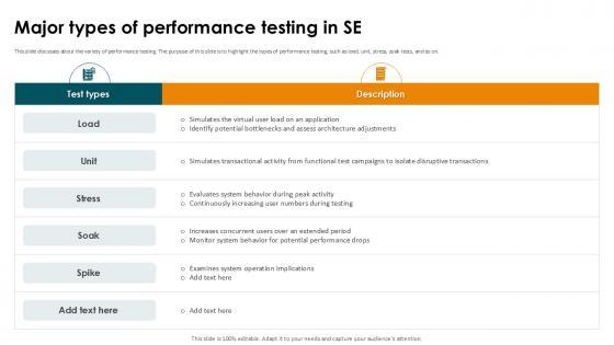 This slide discusses about the variety of performance testing. The purpose of this slide is to highlight the types of performance testing, such as load, unit, stress, soak tests, and so on. Take your projects to the next level with our ultimate collection of Major Types Of Performance Testing In SE Smoke Testing Ppt Presentation. Slidegeeks has designed a range of layouts that are perfect for representing task or activity duration, keeping track of all your deadlines at a glance. Tailor these designs to your exact needs and give them a truly corporate look with your own brand colors they will make your projects stand out from the rest This slide discusses about the variety of performance testing. The purpose of this slide is to highlight the types of performance testing, such as load, unit, stress, soak tests, and so on.