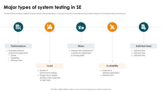 This slide outlines the different categories of system testing in software engineering. The purpose of this slide is to showcase the types of system testing, which include performance, load testing, etc. Find a pre-designed and impeccable Major Types Of System Testing In SE Smoke Testing Ppt Sample. The templates can ace your presentation without additional effort. You can download these easy-to-edit presentation templates to make your presentation stand out from others. So, what are you waiting for Download the template from Slidegeeks today and give a unique touch to your presentation. This slide outlines the different categories of system testing in software engineering. The purpose of this slide is to showcase the types of system testing, which include performance, load testing, etc.