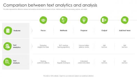 This slide represents the difference between text analytics and text analysis based on focus, methods used for text processing, purpose, and output. Make sure to capture your audiences attention in your business displays with our gratis customizable Comparison Between Text Analytics And Analysis PPT Presentation SS. These are great for business strategies, office conferences, capital raising or task suggestions. If you desire to acquire more customers for your tech business and ensure they stay satisfied, create your own sales presentation with these plain slides. This slide represents the difference between text analytics and text analysis based on focus, methods used for text processing, purpose, and output.