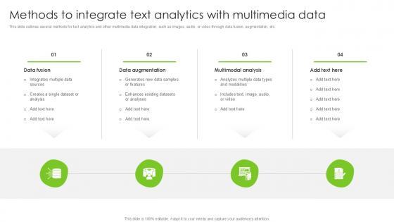 This slide outlines several methods for text analytics and other multimedia data integration, such as images, audio, or video through data fusion, augmentation, etc. The Methods To Integrate Text Analytics With Multimedia Data PPT Powerpoint SS is a compilation of the most recent design trends as a series of slides. It is suitable for any subject or industry presentation, containing attractive visuals and photo spots for businesses to clearly express their messages. This template contains a variety of slides for the user to input data, such as structures to contrast two elements, bullet points, and slides for written information. Slidegeeks is prepared to create an impression. This slide outlines several methods for text analytics and other multimedia data integration, such as images, audio, or video through data fusion, augmentation, etc.