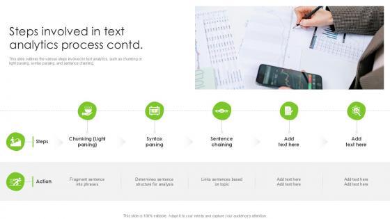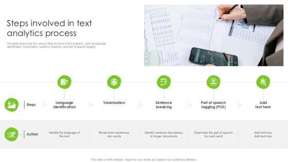 This slide showcases the various steps involved in text analytics, such as language identification, tokenization, sentence breaking, and part-of-speech tagging. This Steps Involved In Text Analytics Process PPT Presentation SS from Slidegeeks makes it easy to present information on your topic with precision. It provides customization options, so you can make changes to the colors, design, graphics, or any other component to create a unique layout. It is also available for immediate download, so you can begin using it right away. Slidegeeks has done good research to ensure that you have everything you need to make your presentation stand out. Make a name out there for a brilliant performance. This slide showcases the various steps involved in text analytics, such as language identification, tokenization, sentence breaking, and part-of-speech tagging.
